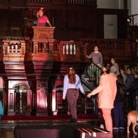 In 2025, the story feels chillingly present and the modern day costumes including streetwear and machine gunned guards made us feel it all the more. The production made excellent use of Pitt Street Uniting’s three-tiered space, with singers appearing from balconies, aisles and stairwells. The famous chorus, Va, pensiero, emerged from all around us, ghostlike, sung from within and among the audience. It was hair-raising."